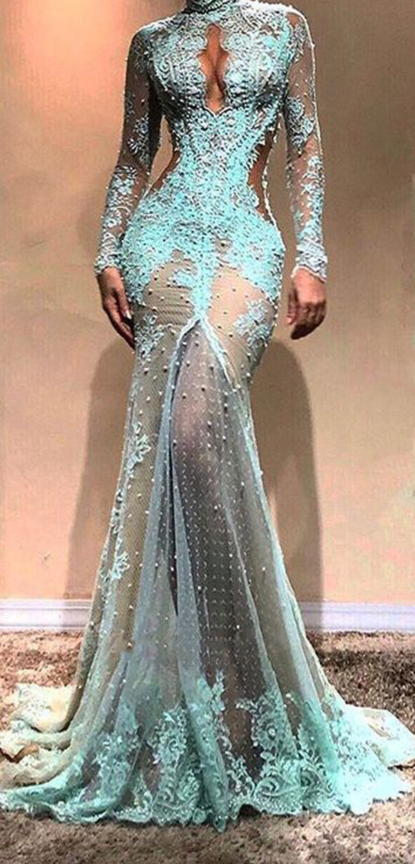High Neck Blue Lace Beaded Long Sleeves Elegant Unique Long Prom Dresses ,PD1005