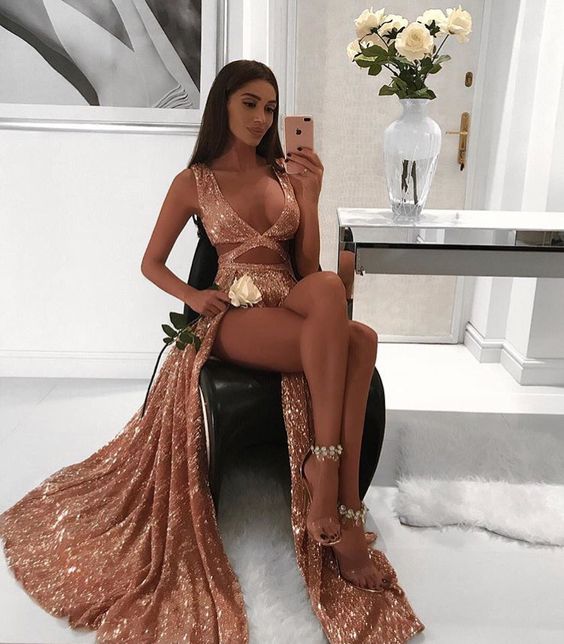 Charming Sexy Sequin Sparkly Simple Rose Gold and Black Split Fashion Popular Prom Dresses, Evening dresses