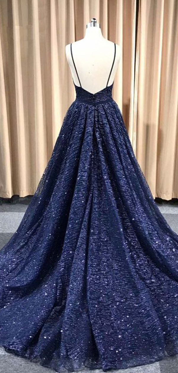 A-line Spaghetti Straps Sparkly Navy Blue Sequin Long Shining Gorgeous Prom Dresses,PD1020