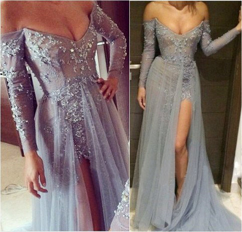 long prom dress, gray prom dress, lace prom dress, off shoulder prom dress, side slit sexy prom dress, evening dress.