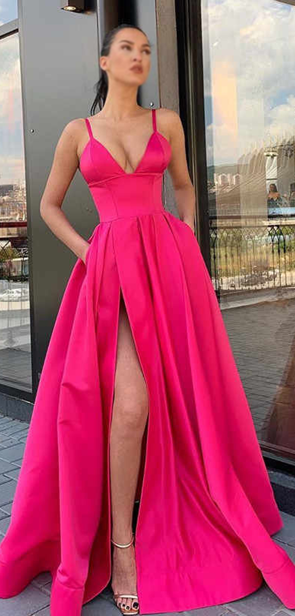 Cheap Satin Blue Long A-Line V-Neck Strap Spaghetti Side Slit Prom Dresses, Party Gowns,BD1562