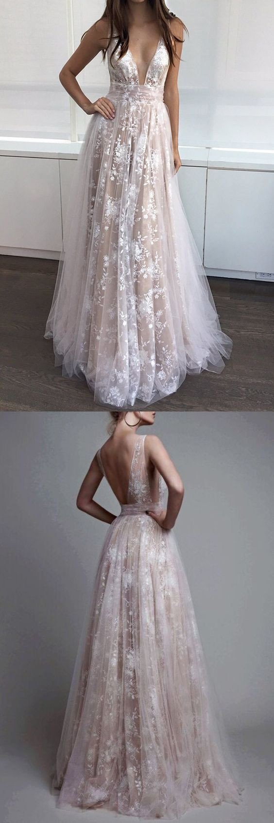 2017 Long Sexy Deep V-Neck Tulle Lace Appliques Floor-Length A-Line Party Prom Dress, BD1566