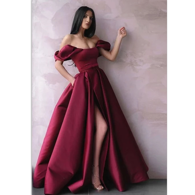 A-line Off the Shoulder Satin Burgundy Long Modest Prom Dresses with slit ,PD1008